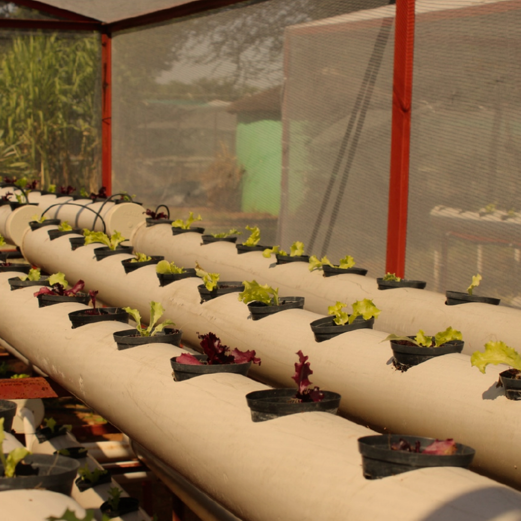 Hydroponics units producing food and covering operating costs, demonstrating climate-smart sustainability.